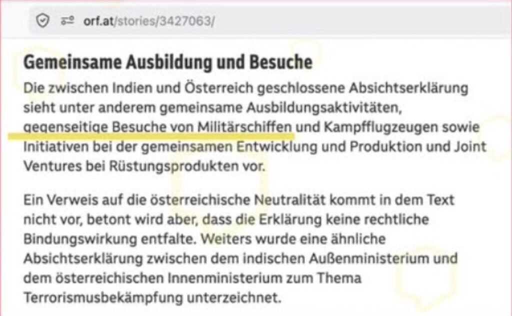 Die zwischen Indien und Österreich geschlossene Absichtserklärung sieht unter anderem gemeinsame Ausbildungsaktivitäten, gegenseitige Besuche von Militärschiffen und Kampfflugzeugen …vor.Â