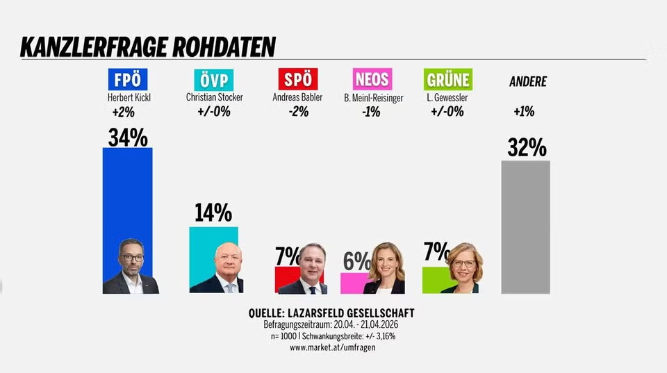 Damit ist Kickl der einzige Parteichef, der klar über dem Unterstützungsniveau seiner eigenen Partei liegt; die FPÖ kommt in derselben Umfrage sowie in den aktuellen Sonntagsfragen auf rund 37 Prozent. Im direkten Vergleich der Kanzlerpräferenzen schneiden die anderen Parteispitzen deutlich schwächer ab. Aktuell würden nur 14 Prozent Amtsinhaber Christian Stocker (ÖVP) und lediglich sieben Prozent SPÖ-Vizekanzler Andreas Babler als Bundeskanzler wählen. Selbst in Prognosen, die etwas günstiger für die Regierungsparteien ausfallen, bleibt Kickl mit etwa 26 bis 32 Prozent klar vorne, während Stocker typischerweise zwischen 15 und 17 Prozent und Babler zwischen acht und elf Prozent liegt.